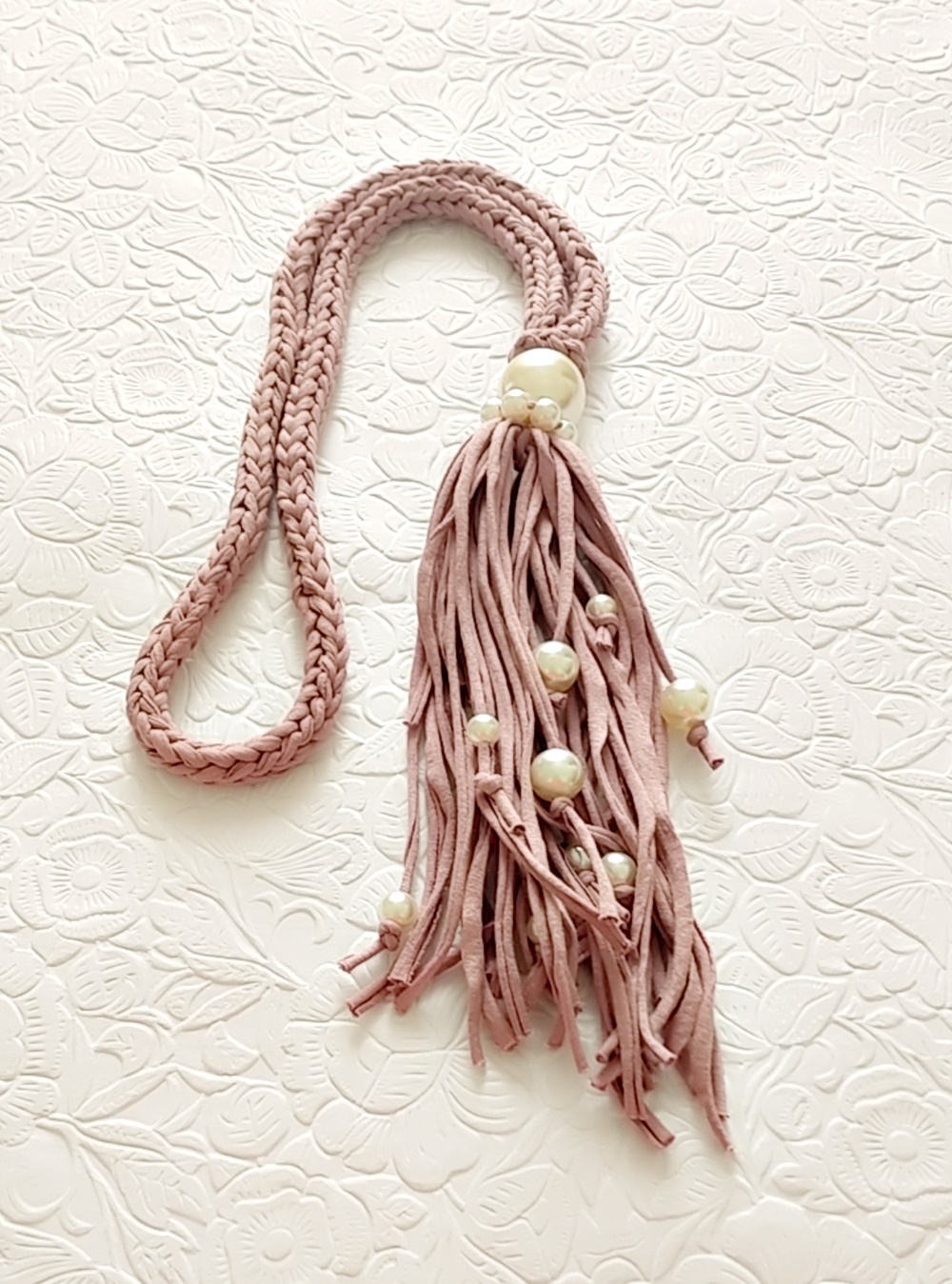 feito em fio de malha com perolas